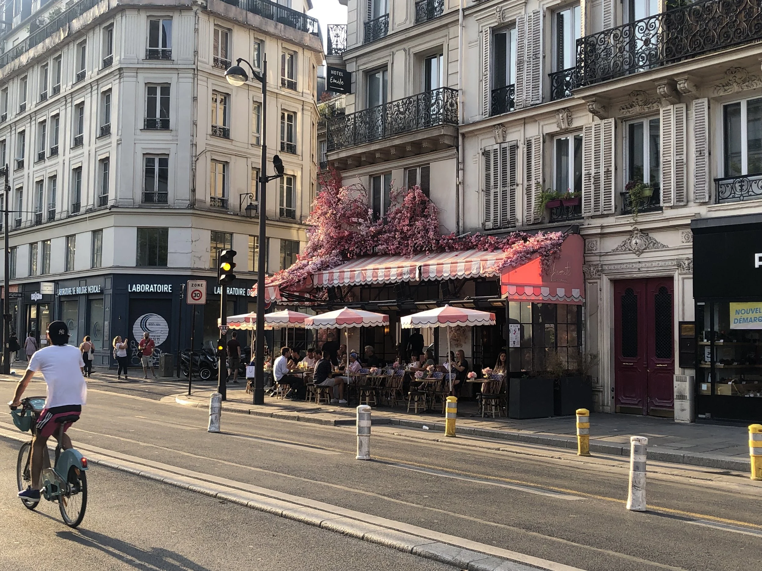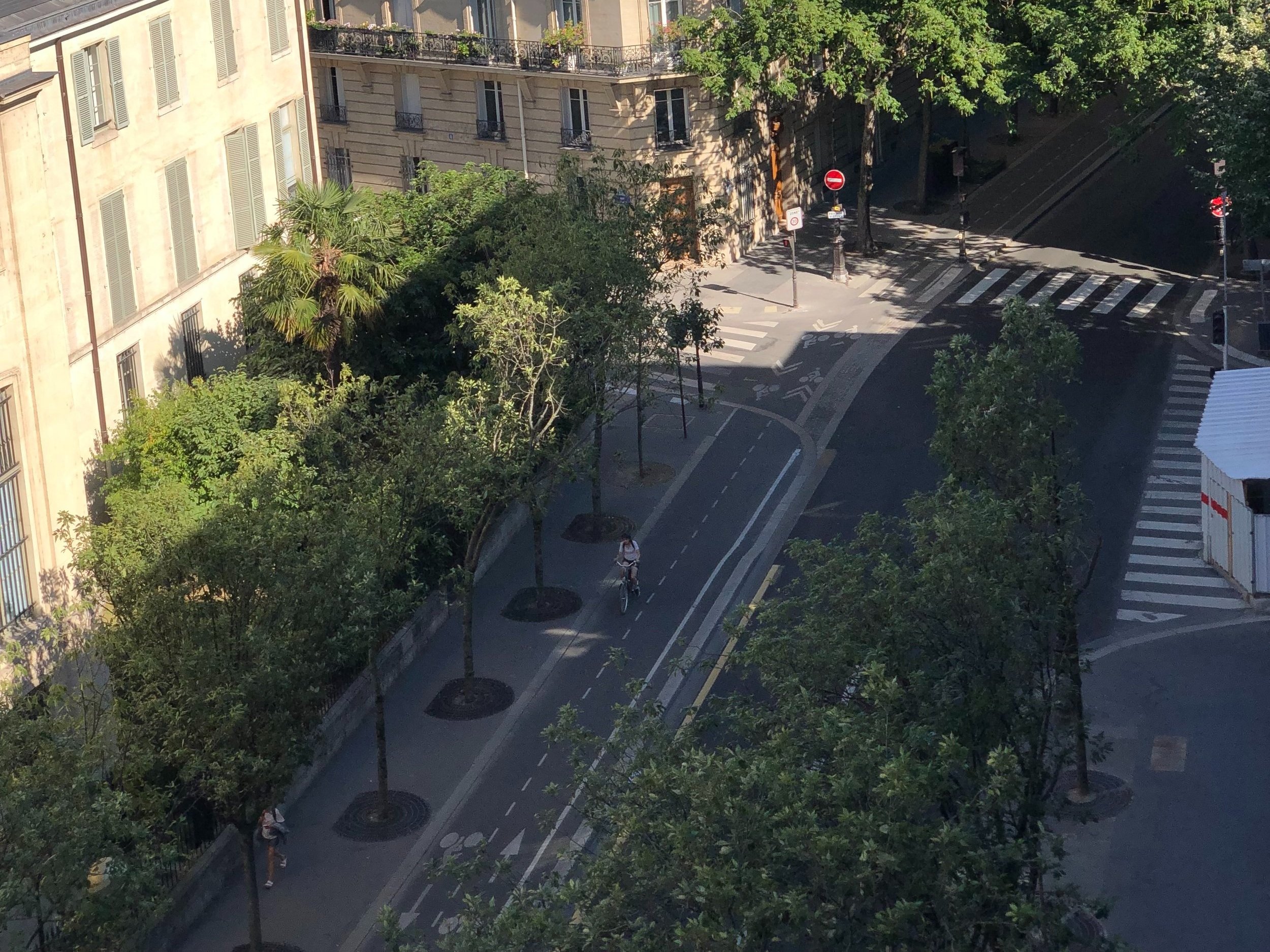 A cycle track, car lanes, and plenty of space for a sidewalk cafe. Paris.